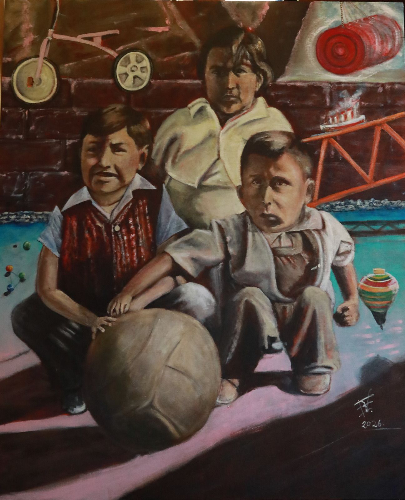En esta exposición podemos apreciar obras en diferentes técnicas y estilos, que nos muestran diferentes tipos de juguetes, desde los ositos de peluche, muñecas, trompos, trenecitos, niños jugando, en fin diferentes juegos que han sido la diversión de muchos pequeños y grandes.